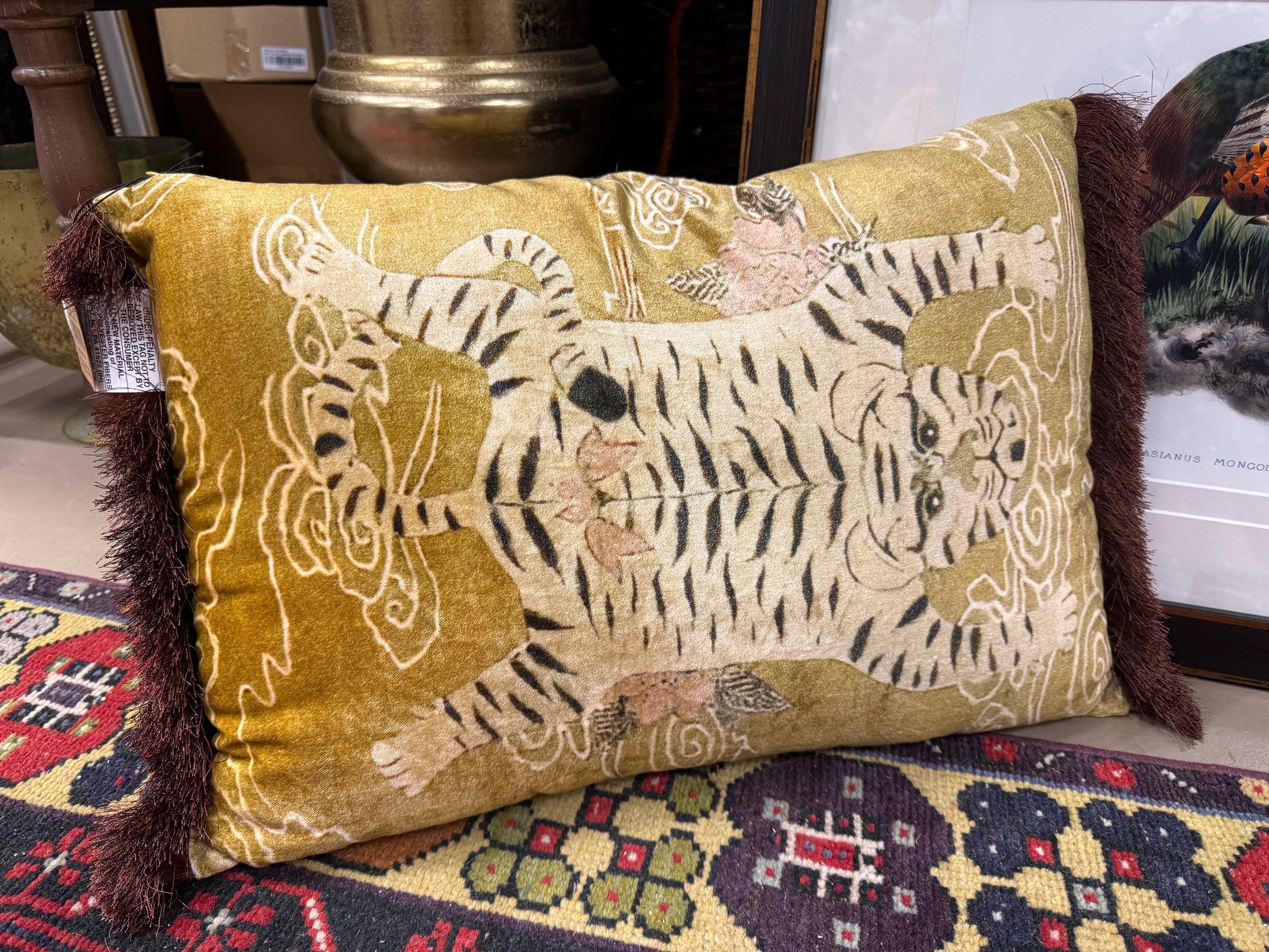 Velvet Printed Lumbar Pillow w Tibetan Tiger & Fringe